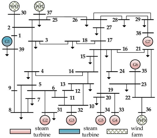 To verify the effectiveness and accuracy of the renewable energy unit inertia identification method and the minimum frequency point calculation method proposed above, a simulation model of an IEEE system with 10 machines and 39 nodes was built using the PSCAD/EMTDC platform. The system topology is shown in Figure 8.