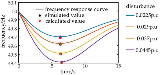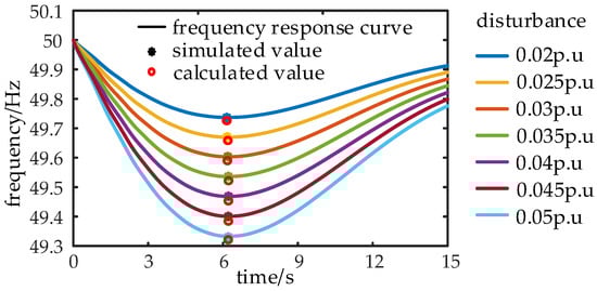 On the basis of the identification of the HNE of the wind farm, the accuracy of the G-ASF-H model under different disturbances was further studied. Figure 9 is a comparison chart between the actual frequency response (curve) of the system and the calculated value (red circle) of the proposed minimum point frequency prediction method after applying different disturbances. The maximum disturbance in the figure is 0.05 p.u, the minimum disturbance is 0.02 p.u, and the disturbance difference between the curves is 0.005 p.u. Figure 10 is a comparison chart between the actual frequency response (curve) of the system and the calculated value (red circle) of the proposed minimum point frequency prediction method under different load increments.
