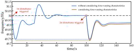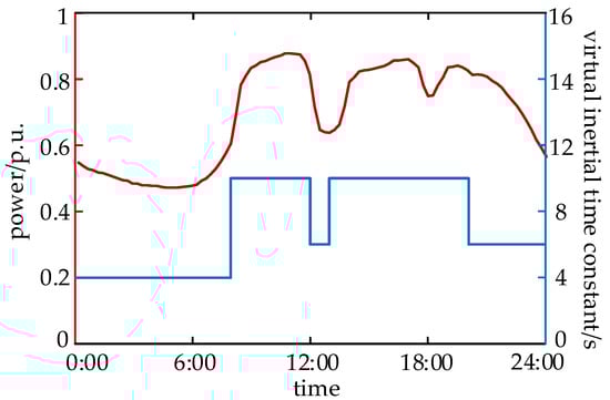 To further verify the accuracy of the proposed calculation method in actual operation scenarios, we took the typical daily load curve of the actual power grid in a certain area as a reference. We selected 96 points in the daily load data of a certain day and calculated the lowest frequency point of each point in the case of the system load step; the load increase range was 120 MW, and the maximum load was set to 95% of the total power generation. Figure 11 shows the daily load curve and the virtual inertial time constants corresponding to the renewable energy stations at different times. Figure 12 shows the frequency response of the system when considering the time-varying characteristics of the virtual inertia of the new energy station and not considering the time-varying characteristics. It can be seen that considering the time-varying characteristics of the virtual inertia of new energy stations makes it possible to better reflect the frequency response process of the actual system after a disturbance.