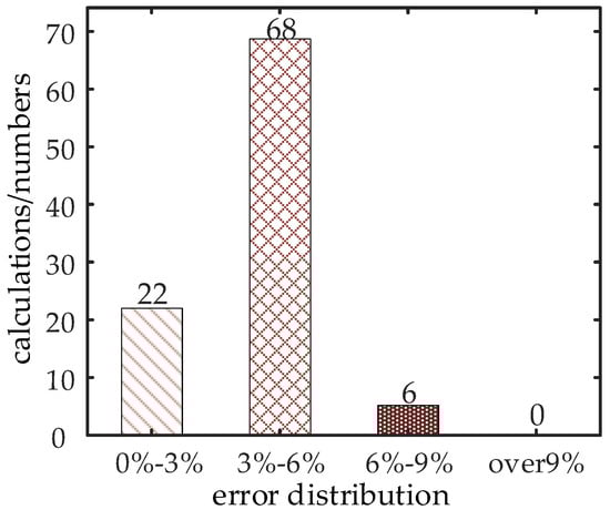 Figure 13 shows the calculation error distribution of the minimum frequency point at different times under the daily load curve for the G-ASF-H model considering the time-varying characteristics of the virtual inertia. It can be seen from the figure that the calculation error of less than 3% accounted for about 22.9%, the calculation error of 3–6% accounted for about 70.8%, and the calculation error of 6–9% accounted for about 6.3%. The results show that the proposed calculation method could accurately give the lowest frequency point of each point, and the maximum error did not exceed 9%. It can be seen from this example that the proposed method is suitable for online frequency security assessment.
