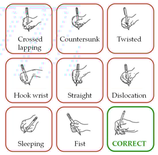 Poor pen-holding postures (PHPs) may increase the incidence of myopia in students. Danjie Jiang [] studied how reading and writing posture are related to myopia. The author concluded that keeping an adequate distance between the eye and the book is beneficial to preventing and managing myopia. Li Wei [] reported that the duration of the reading and writing tasks affected the writing quality of Chinese characters. Li Wei also showed that correct PHPs can produce high-quality strokes in writing. Therefore, it is essential to recognize the type of PHP and distinguish the incorrect PHPs.