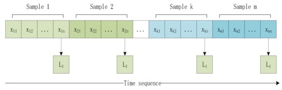 Using 48 processing formulas, we generate 48 writing features. After labeling their data, they can enter it into the proposed SSC model. For the input data of the MSC, additional processing of single stroke samples is required. Multiple single-line samples with temporal order are grouped according to their sequence length. The writing task consists of 28 Chinese characters broken down into 131 strokes. After taking their average values, they are rounded to 4. Therefore, the MSC in the model considers four strokes as one sample. The data style is shown in Figure 3, where represents the sample and represents the label.