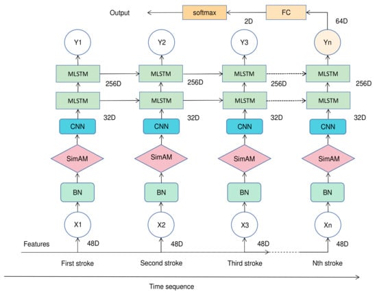 The network model first combines several SimAM modules, the number of which is equal to the number of strokes () in a multiple-stroke sample. Four CNN layers that independently extract features to ensure their temporal independence follow each SimAM module. When the input data and the feature vectors of multiple strokes, are fed into multiple identical SimAM-CNNs, 32-dimensional data are formed. By combining MLSTM, the convolution output can be fed sequentially into two MLSTM layers, with the output size of the first MLSTM layer being 256 and that of the second layer being 64. The output of the last state of the second layer is used as the input of the fully connected (FC) layer, and then the FC layer is used to transform the 64-dimensional data into two-dimensional data. Finally, the Softmax activation function is applied to transform the probability distribution vector to recognize PHPs. The data dimension of the SimAM-CNN-MLSTM network for the multi-stroke datasets is shown in Table 3. In Table 3, represents a feature vector consisting of 48 stroke features. The complete flowchart of the SimAM-CNN-MLSTM network is shown in Figure 5, where represents the dimension.