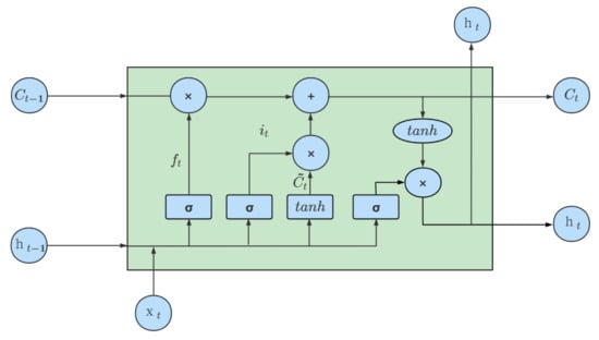 Input gate: The output of the previous cell and the input of this cell cooperate with the rate function to control the addition of new information. and are the weight matrices of the input gate and cell state, respectively. and represent the bias terms of the input gate and cell state, respectively. The input gate is given by (11). Meanwhile, as explained in (12), the new input information is calculated by the tanh function to generate a new candidate value, which determines the information that will be updated in the cell state.