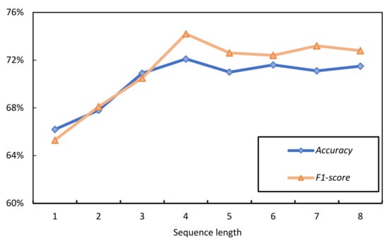 All the experiments show that the highest accuracy of the results is 72.1% when the step length is 4. However, when the step length increases in the time dimension, the model learns more redundant data, which leads to a decrease in accuracy. The average of the features of each Chinese character is also taken into account. Therefore, a sequence length of four is chosen in the proposed model.