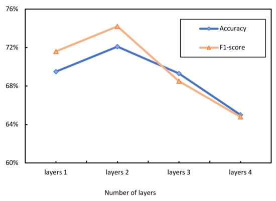 We also examine the performance under different layer structures. As shown in Figure 9, it appears that the accuracy and F1-score are better with a two-layer structure. The other parameters of the model are invariant during the tests.