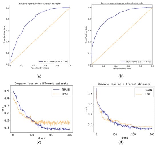 Points (a) and (b) in Figure 11 show that the area under the ROC curve (AUC) is 0.78 for SimAM-TabNet and 0.85 for SimAM-CNN-MLSTM. According to the criterion that the higher the AUC value, the higher the accuracy of the prediction model, it can be concluded that the classification performance of the SimAM-CNN-MLSTM prediction model is better than the SimAM-TabNet model. Observing the loss curves in (c) and (d) of Figure 11 shows that the loss of SimAM-TabNet and SimAM-CNN-MLSTM decreases as the number of iterations increases. Fortunately, the loss of SimAM-CNN-MLSTM in the test set decreases more steadily than that of SimAM-TabNet, indicating that SimAM-CNN-MLSTM is stable. Therefore, multiple stroke samples extract better writing characteristics than single stroke samples.