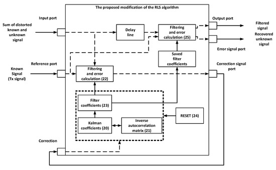 Algorithms 3. Modified Recursive Least Squares. A modification of the classical RLS algorithm was used to improve the quality of the adaptive filter in the power line channel. The main change is that the filter weights are calculated over a period of time . In our case, the duration of one OFDM symbol was taken as time T1. After that, the calculated value is written to the register. The original vector of the weighting coefficients, the inverse correlation matrix and the vector of the Kalman coefficients are reinitialized. During the next period of time , the calculation of the weighting coefficients continues, while the filtering of the signal is carried out using the coefficients stored in the register. This procedure is repeated throughout the filtration process. The functional diagram of the algorithm is shown in Figure 2. Function blocks in Figure 2 contain references on the equation related to the operation performed in the block.