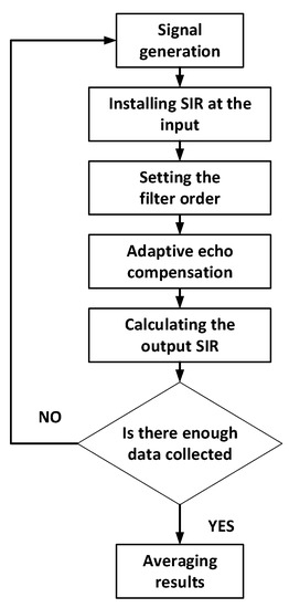 In this article, a full-duplex data transmission is carried out in the power supply circuit. We consider only digital cancellation, for which an adaptive filter is used. Some approaches to using adaptive filters for echo cancellation are described in [14,15,17]. A schematic diagram of an adaptive filter operating in echo cancellation mode is shown in Figure 1.