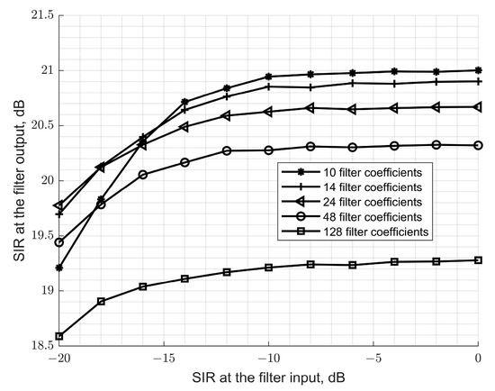 Figure 4 shows the dependence of SIR at the filter input on SIR at the filter output with a different number of coefficients.