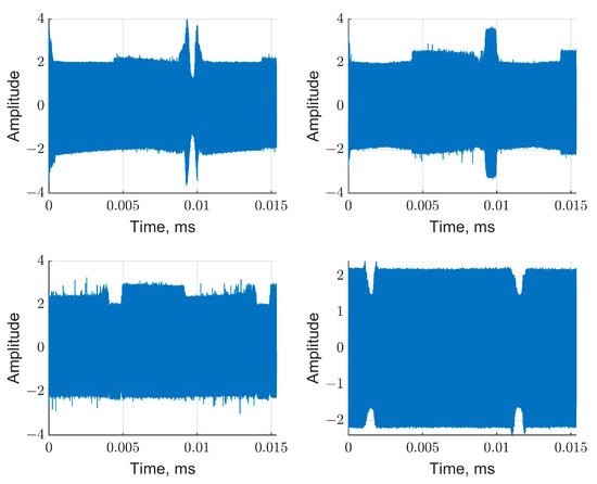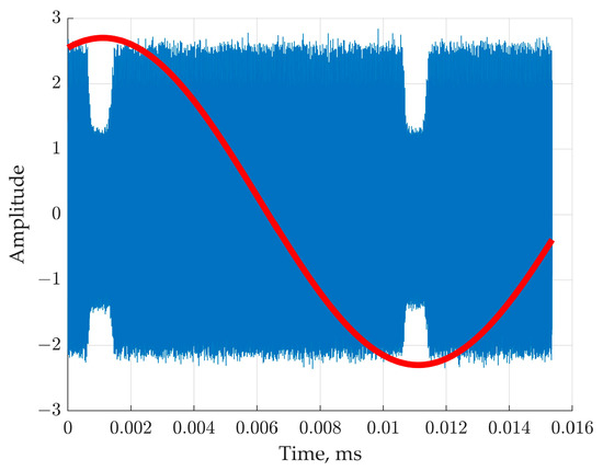 Figure 5 demonstrates that periodic changes in amplitude are present in the arrays. This effect is due to the influence of variable voltage in the power grid and diode rectifiers [18]. These dips occur at a frequency of 100 Hz. Under such circumstances, the channel can be considered cyclostationary. Figure 6 shows the received array with an overlay of a harmonic signal that repeats the shape of the variable component of the power supply circuit.