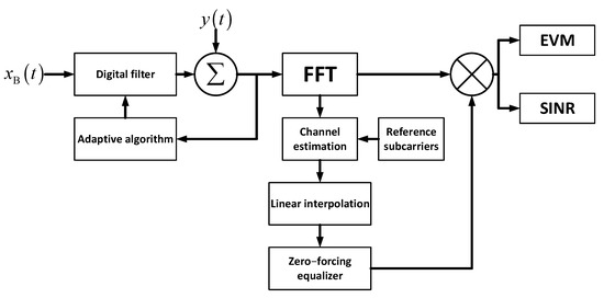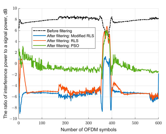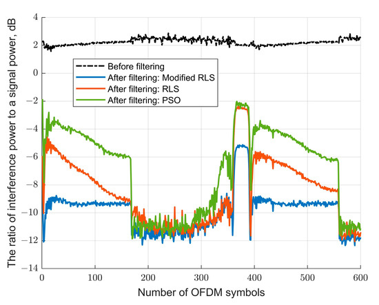 The received data were temporally synchronized with the useful signal and 600 OFDM symbols were then extracted. An adaptive filter that operates according to the algorithms discussed in Section 2 is used to suppress the interference signal and extract the useful signal. The three previously described methods were used in the processing of the accepted data.