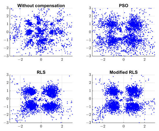 Figure 10 shows the constellation diagrams obtained without using cancellation algorithms, using the PSO algorithm, using the RLS algorithm and using the RLS modification, respectively.
