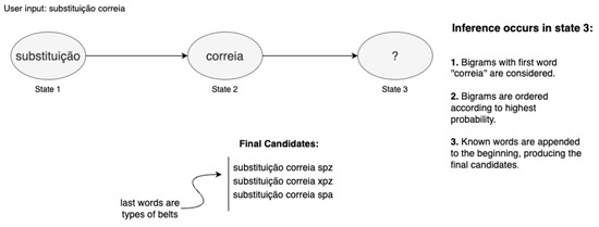 For instance, when the user inputs the words “substituição correia” (“belt substitution”), the state that is consulted to assess the candidates for the next word is State 3, due to the next word being in position 3, as depicted in Figure 2. In this state, the algorithm looks for all the bigrams that begin with the word “correia”, and sorts them according to their probabilities, placing the highest first. The probability of occurrence of each bigram is initially calculated through a frequency analysis of the inputted corpus of text during network creation. Word position is respected. Regarding State 3, it only contains bigrams composed of words that are in positions 2 and 3 of a sentence. In the example given in Figure 2, the candidates returned are types of belts, and the suggested words are the last words in each bigram (spz, xpz, and spa).