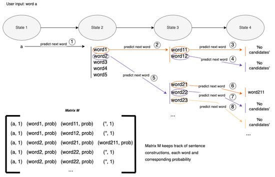 The algorithm chooses a word in a given state and searches for the next group of candidates to complement this word in the next state. If the following state has candidates, the same procedure is applied to each candidate. Suppose the following state does not have information about possible candidates for the given word. The sentence is considered constructed. In that case, it is appended to the matrix, and the focus shifts again to the previous state. Then, the following word from the list of possible suggestions is considered, and the process repeats itself until the network is covered.