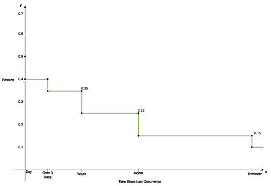 Network adaptation is achieved by analysing the chosen suggestions (creating user feedback) to adapt to the current needs verified by the technicians. Figure 4 outlines the reward function implemented to support this user feedback mechanism. As illustrated, a decay function decreases as time passes, assuming that the highest rewards are allocated to situations that occur often. The values given for the function seem to be out of context. However, an empirical study on the most appropriate values for the function is conducted in the next section.