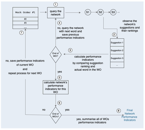 Observation of Figure 5 allows us to understand that the methodology begins with a sequence of carefully chosen WOs; the RS has not “seen” this sequence before, that is, from the entirety of the WOs, a subset is taken for training and a different subset for testing. For the sake of simplicity in the methodology’s overview, let us consider a sequence that starts with the situations limpeza cilindro humidificador” (“humidifying cylinder cleaning”) and “substituição filtro” (“filter replacement”). In step ①, the procedure starts by taking the first sentence, looking at the first word, and querying the network for suggestions, as if the technician was inputting this WO. After querying the network for “limpeza”, the recommendations are observed in step ②. The performance indicators of this given case are calculated in step ③, following in what rank the network put the word “cilindro”, because this word corresponds to the reality, that is, what the technician intended to write. The metrics chosen to evaluate the network are discussed in the following subsection. Let us assume that there is one metric in the performance indicators, which ranges from zero to one hundred percent, named mean reciprocal rank (MRR) [24,25] and discussed in the next subsection. Let us also assume that the network ranked “cilindro” in the first place, which means MRR for this case. After calculating the MRR for this word, the procedure is repeated, because the first sentence still has another word; step ④; takes the procedure back to the first sentence, and now the network is queried for suggestions for the case “limpeza cilindro”. The network’s recommendations are observed in step ②, and in step ③; the performance indicators for this new case are calculated. This time, the network ranked “humidificador” in place five out of ten, for example, so let us assume the MRR is (the calculation of the MRR and other performance indicators is left for the following subsection, for simplicity of explanation of the methodology). Once the performance indicators are calculated for this case, and the sentence reaches its end, in step ⑤, it is possible to summarise the performance indicators for this first WO: considering only the MRR, for simplicity of explanation, the average between from the first suggestion and from the second gives a total of MRR for this first WO. Step ⑥; evaluates whether the sequence of WOs has reached the end. Since there are more WOs in the sequence that have not been processed, the procedure shifts its focus to the next one in step ⑦, which is “substituição filtro”, and saves the performance indicators of the previously tested WO. In this second WO, the procedure is repeated. Take the first word, “substituição”, and query the network. Observe the rankings and compute the performance indicators based on what position the intended word “filtro”. Since this WO only has two words, only one suggestion is made, and the final performance indicators of the sentence are the same as the suggestion.