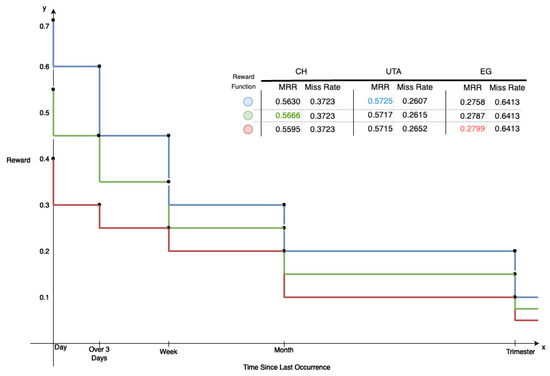 A critical component of the presented solution is the reward function, which provides the implicit user feedback mechanism with the notion of how much time has passed between the same asset management situation and how the suggestion that the technician selected should be rewarded. Figure 6 presents three different reward functions, coloured in blue, green, and red. The motivation for this study is to understand the impact of the values given to the reward function by shifting it in the reward axis. Hence, by shifting the importance of the reward associated with each period present on the x-axis, it is possible to produce three functions and study the effect of the reward values on the overall solution. Remember, these values are calculated based on the intricacies of the domain and how the management of work orders is performed. Work orders can occur due to planned preventive activities or corrective operations needed in a given asset. The reward values and periods are designed to meet how the work orders are created and managed in the asset management domain.