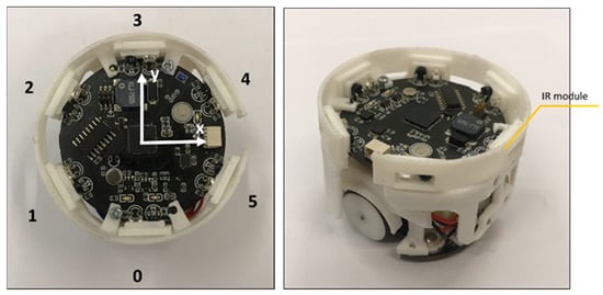 The performances of the proposed model are evaluated through tests conducted in both simulation and real experiments. All tests use the same robot platform, which is shown from a top and perspective view in Figure 1. The robot platform is cylindrical in shape with a radius of 25 mm and height of 40 mm, respectively. The inter-wheel and radius of each wheel are 40 mm and 20 mm, respectively. The robot is equipped with six infrared modules with the order shown in Figure 1. With six infrared modules, the maximum number of neighbors of each robot obviously is six also. Without adding information, the default communication range and default sensing range of these infrared modules are approximately 180 mm and 20 mm, respectively. For convenience, the proximity sensor threshold is set to a value which is equivalent to the sensing range . Finally, the robot linear speed can reach 35 mm/s. However, due to the communication speed not being fast enough, hence, the maximum linear speed is set to 20 mm/s according to the experiments.