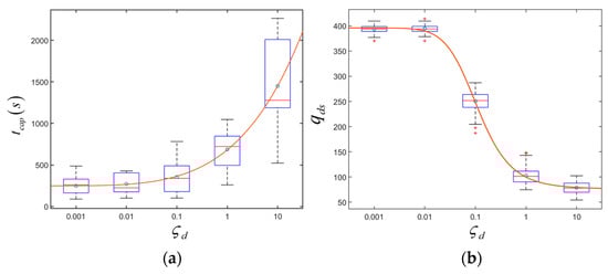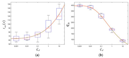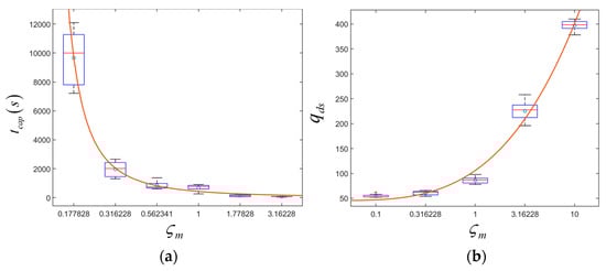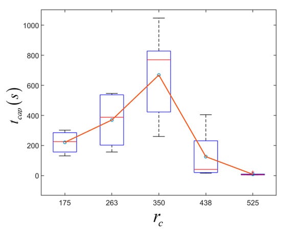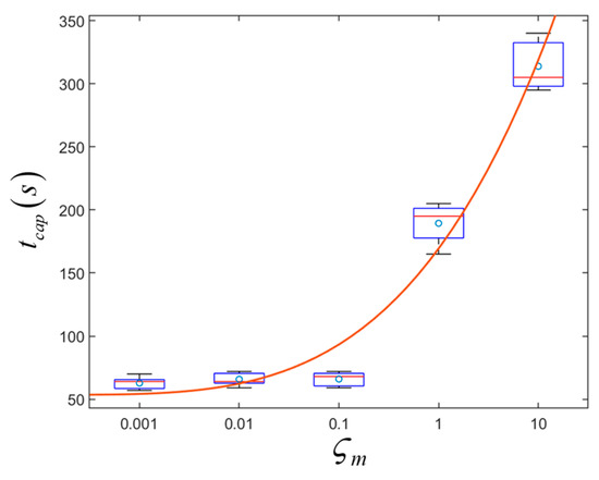 The influence of is also investigated with values of 0.001, 0.01, 0.1, 1 and 10, with the results divided into two cases. In the first one, when , the relationship between and in experiments is virtually constant with values comparable to those shown in Figure 7a with corresponding . This is due to the fact that the size of the arena and the size of the swarm in tests are unlikely to generate local optimal results. That means that throughout their exploration, swarm robots are more likely to identify a single aggregate cluster rather than construct a single member cluster. As a result, with , the robot has enough time to participate in the single aggregation cluster before members of this cluster leave due to increasing expectations. Meanwhile, when , the expectation growth of members in the single aggregation cluster is very large compared to the default value of . Hence, the swarm will always rapidly fill in their expectations and leave a cluster, and the swarm will spend the majority of its time roaming. As a result, is unable to be recorded and grows exceedingly huge. The relationship between and may be observed in Figure 8. Furthermore, provides a high-quality aggregation cluster with . Based on these observations, can be an arbitrary chosen value less than 0.1. However, to avoid the case of local optimization, where many clusters of the same size are formed, should be large enough to promote the emergence of a single aggregation cluster. Hence, is chosen to optimize the aggregation process in both a typical case and a local optimization case.
