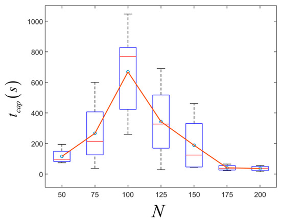 In this section, the aggregation performance is examined to see how it is affected by the swarm size. During this test, the swarm size is varied when the arena size is constant. Eight sets of experiments with are investigated. In this section, the aggregation behavior is evaluated using only , since the dispersion metric depends on the swarm size. The results of the test are shown in Figure 4.