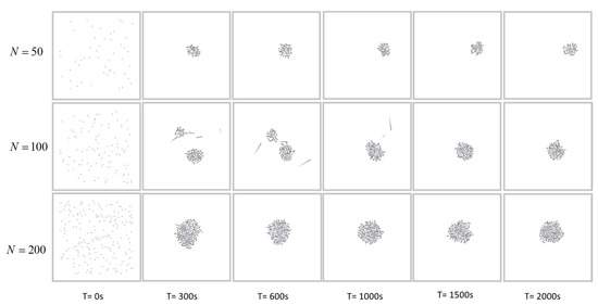 To illustrate the quality of the aggregation method, the captures of the aggregation process of typical cases in a set of experiments with swarm sizes of 50, 100 and 200 are shown in Figure 5. In case of , the convergence of the process is very fast. However, due to the swarm size being small compared to , the aggregation of the swarm is unstable. This problem is solved when , but also increases rapidly.