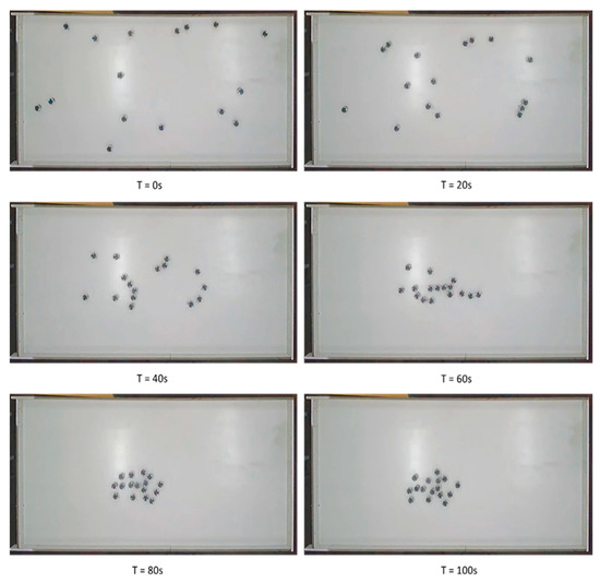 Figure 9 shows captures of a typical aggregation process in a real scenario with and . This process has and , which meet the requirements of the aggregation process results. In the first capture, when , the robots used in the process were manually distributed in the arena with . After receiving the aggregation instruction from the server, all of the robots in the swarm undertake the aggregate task at the same time. In the first 20 s, robots generate a slew of small, disjointed clusters. However, due to the tiny arena size, these clusters immediately linked with one another, resulting in a single aggregation cluster after around 60 s. The process continues until the collection stabilizes, and then, is recorded.