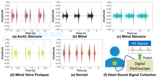 In this dataset, Yaseen et al. [20] proposed four types of abnormal HS signals, namely AS, MR, MS, MVP, and the normal signals, with 200 recordings for each type. The actual sampling rate is 8 kHz. In addition, all signal amplitudes are normalized between −1 and 1. The length of HS signals is from 1.16 to 3.99 s. Representative examples of each type of HS signals are shown in Figure 1a–e. Figure 1a shows the waveform of AS, Figure 1b the waveform of MR, Figure 1c the waveform of MS, Figure 1d the waveform of MVP, Figure 1e the waveform of standard HS signal, and Figure 1f how the HS signal is collected.