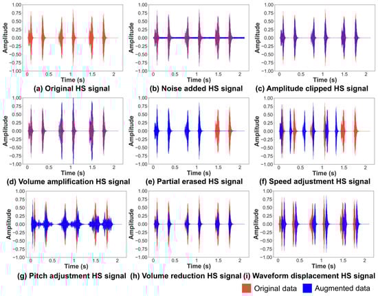 The representative HS signals after data augmentation are shown in Figure 2a–i. Figure 2a shows the waveform of the original standard HS signal; Figure 2b the waveform of the standard HS signal after adding noise; Figure 2c the waveform of the standard HS signal after amplitude clipping; Figure 2d the waveform of standard HS signal after volumn aplification; Figure 2e the waveform of standard HS signal after partial erasing; Figure 2f the waveform of standard HS signal after speed adjustment; Figure 2g the waveform of standard HS signal after the pitch adjustment; Figure 2h the waveform of standard HS signal after volume reduction; Figure 2i the waveform of standard HS signal after waveform displacement. These eight methods are used for data enhancement for all HS signals. As can be seen from Figure 2b–i, the red part represents the original HS signals. In contrast, the blue part represents the HS signals after the data augmentation, which introduces differences without changing their essences.