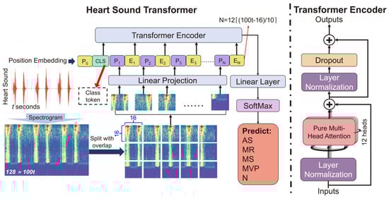 Furthermore, the preprocessed HS signal was further processed into the input sequence of the proposed model. The transformer encoder contained an embedding dimension of 768, 12 layers, and 12 heads [26,28]. As a final step, the transformer encoder’s output was subjected to a linear layer with a Sigmoid activation function to facilitate the classification.