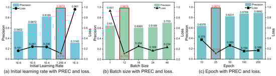 We ran a series of simulations with different sets of hyperparameters. For each simulation, 80% of the 1000 original HS signals were randomly selected for training and 20% for validation before data augmentation. The data used for training and validation were independent of each other. The hyperparameter set included the initial learning rate (), batch size, and training epochs. Figure 5a–c show the relationship among the three hyperparameters—precision, loss, and epoch. Formulas (1) and (2) show the loss function. In addition, we used the Adam optimizer [30] in the proposed model. The final initial learning rate, batch size, and training epoch were 0.000125, 12, and 25, respectively.