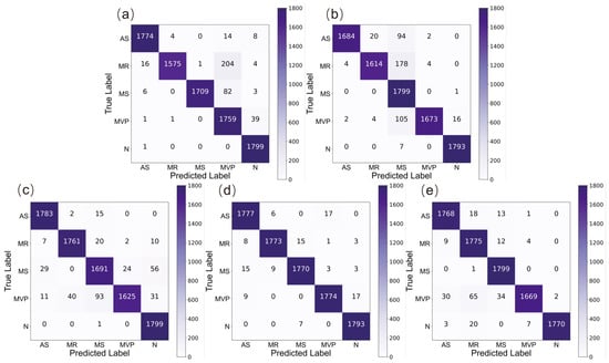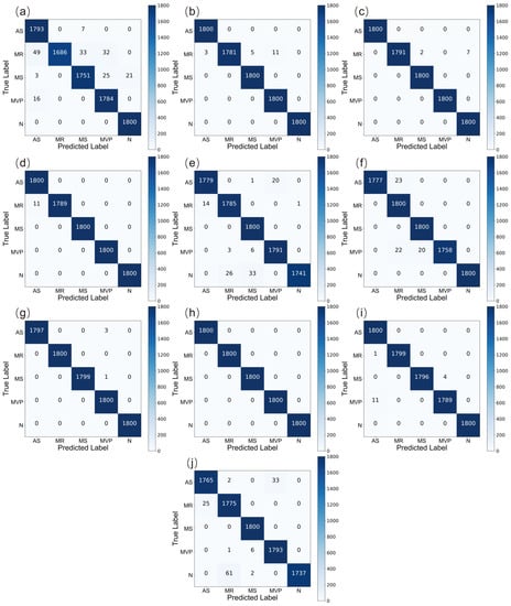 Figure 6 and Figure 7 show the confusion matrices for each fold of the 5-fold cross-validation and the 10-fold cross-validation, respectively. The X-axis represents the predicted labels exported from the system, while the Y-axis represents the actual labels of the HS signals. Figure 6a–e show the confusion matrix for the best model in each fold of the 5-fold cross-validation on the independent testing set, in order. Figure 7a–j show the confusion matrix of the best model in each fold of the 10-fold cross-validation on the independent testing set, in order. Table 1 and Table 2 show the performance of the 5-fold cross-validation and 10-fold cross-validation respectively.