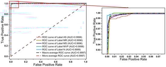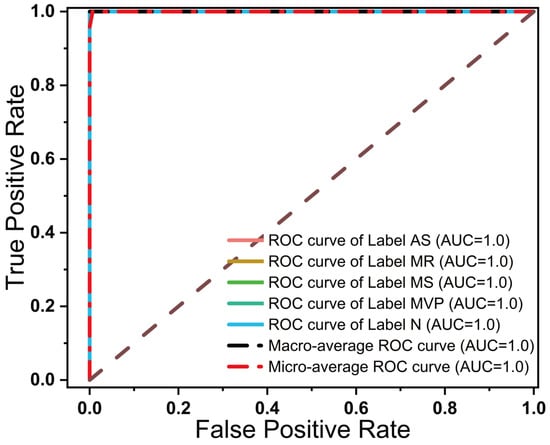 Table 3 shows the classification results by using the best model from 5-fold cross-validation. We used PRE, SENS, SPEC, and F1 score to evaluate the performance of the model. The results show that the model has an average PRE of 98.94% and an average F1 score of 98.74%, which indicates a good performance. However, looking at the performance of each category individually, one can find that the model has some limitations in distinguishing between the “MR” class and the “MVP” class, especially in models that are not well trained, as can also be clearly seen from the confusion matrices in Figure 6.