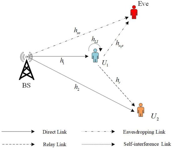 Adopting artificial noise (AN) or jamming signals to degrade Eve’s channel is also a popular PLS technique. For better overall system performance when using AN technology, two RS schemes—optimal relay–receiver pair selection and suboptimal RS—were combined in []. In the multi-antenna Co-NOMA-based IoT network [], AN is generated from both the base station (BS) and the strong IoT node for achieving secure transmission of the system. Compared with half-duplex (HD), FD technology presents an opportunity to enable nodes to complete simultaneous receiving and transmitting on the given frequency band and double or even triple the data rate of the system, which not only improves spectral efficiency but also enhances PLS performance. Reference [] introduced a novel communication scheme that combined NOMA, beamforming, simultaneous wireless information and power transfer, and FD techniques to achieve a higher sum rate in the downlink commutation system. Additionally, three different cases of self-interference (SI) signal in FD mode were adopted to investigate the impact of SI cancellation on system secure performance. In [], one source established communication directly with a multi-antenna near-user, while the source used multiple FD relays to communicate with the distant user in the case of passive Eves. To solve this wiretapping problem, a new FD-based two-stage AN scheme was proposed, where AN is not only an interference signal to prevent eavesdropping but also acts as a secret key to enhance the confidentiality of the distant user. The authors of [] carried out the secrecy outage performance and secrecy diversity order analysis in large-scale NOMA with the aid of FD and AN.