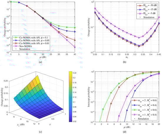 Figure 2 investigates the SRT of under different parameters. The simulation values are the same as the corresponding analytical curves, which confirms the accuracy of the theoretical derivations. Since Eve can only eavesdrop on the signal of from the BS, adding the relay link will have no effect on IP. Therefore, we mainly evaluate the outage performance of . As can be seen from Figure 2a, the trend of OP in the scenario of Co-NOMA with AN and Nco-NOMA is consistent with the increasing of . As illustrated in Section 2, the effective SINR at decoding and is in direct proportion , which affirms that the OP should decrease with the increasing . At high SNR region, the effective SINR at for Nco-NOMA continues to increase with the increasing of , while approaching constants in Co-NOMA with AN. As a result, the performance of the under the Nco-NOMA system continues to increase, while tending to be fixed under Co-NOMA with AN. Compared with Nco-NOMA, in the case of Co-NOMA with AN, the residual self-interference of brings about the decrease in efficient SINR, which increases the OP of . With the values of LI decreasing, the performance gap between Co-NOMA with AN and Nco-NOMA diminishes gradually. Therefore, when the LI is suppressed to be sufficiently small, the performance penalty of caused by FD can be ignored.
