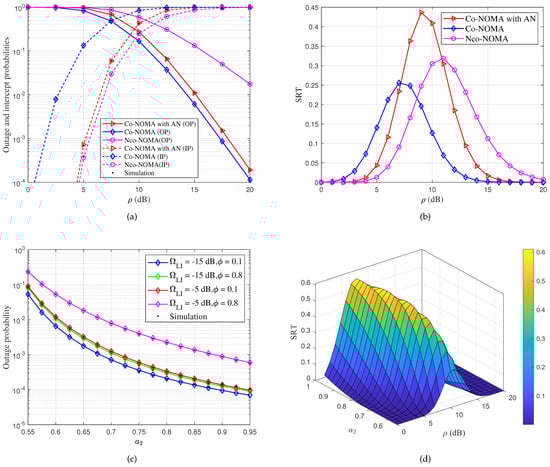 Figure 3c,d evaluate the influence of various parameters on the performance of under the scenario of Co-NOMA with AN. Since the FD residual interference of will only affect OP of , Figure 3c presents OP versus power distribution coefficient with different residual interference values. One observation is that the performance of improves with the increase in . This can be attributed to the fact that the power allocated to becomes larger, resulting in the increase in effective SINR to decode at . Another observation is that the residual self-interference at has little effect on the performance of . Figure 3d describes the SRT versus and . For the same , the trend of SRT with is consistent with Figure 3b. In the region of low SNR, SRT increases as increases and eventually stabilizes. In the region of high SNR, SRT first increases then decreases with , and finally tends to stabilize. This is because as increases, the OP of decreases, while the IP increases. For the low value of SNR, SRT is mainly determined by the OP, while for the high value of SNR, SRT is mainly determined by the IP.