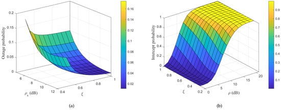 In order to further illustrate the extent to which OP and IP are influenced by the information-bearing ratio and transmission power of the BS, Figure 4 plots the OP and IP of in the case of Co-NOMA with AN. Figure 4a shows the OP of versus and ; one can observe that as increases, the residual interference of becomes weaker, which brings about the improvement in outage performance. Moreover, at the higher value of , as increases, the OP of is significantly improved and eventually reaches saturation with the assistance of the relay link. At the lower value of , the outage performance initially improves gradually with the increasing . As continues to increase, the residual interference of becomes stronger, resulting in a slight decrease in outage performance. Figure 4b presents the IP of versus and . The IP of increases with the increasing value of , which is consistent with that in Figure 3a. When is larger, allocates more power to broadcast the signal of , Eve eavesdrops on by selecting the larger SINR from the BS and as an effective SINR. While is smaller, Eve primarily relies on the BS to decode the signal of by utilizing SC, and thus, along with increasing, IP increases. In addition, the change of has a greater impact on the IP at the low value of .