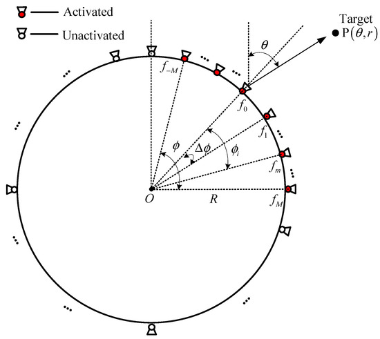 The FDAA adopts open horn-shaped directional array elements that integrate transmitting. As shown in Figure 1, a series of antenna elements are evenly arranged along the arc to form an FDAA. The total number of array elements inside the entire arc is , the array radius is , the angular spacing between adjacent array elements on the arc is , and the angular distance between adjacent array elements on the arc is . The aperture angle formed by the operating elements selected and activated is .