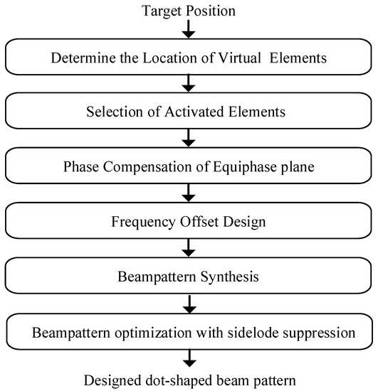 Through the introduction of the FDAA structure in the second section, we can see that, due to wide array element spacing, errors occur in selecting the reference array element for the target. Therefore, in this section, an FDAA beampattern synthesis and optimization method based the virtual array element is proposed. The specific process is described in Figure 3. First, the virtual array element is determined as the reference array element. Then, operating array elements are selected and activated. Next, the phase compensation and frequency design are performed in order to form an equiphase surface. Finally, the beampattern synthesis and optimization are completed.