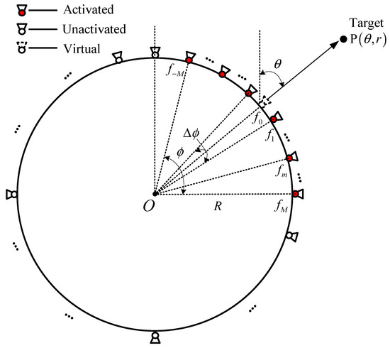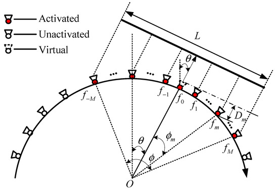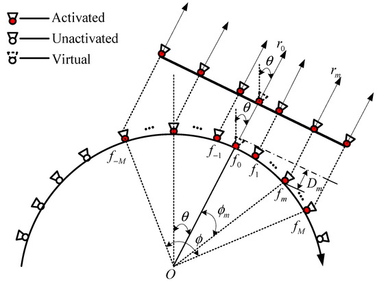 With the virtual array element as the reference, the activated operating array elements are renumbered on both sides. The elements along the arc are numbered 1, …, M in the clockwise direction, and the elements along the arc are numbered −1, …, −M in the counter-clockwise direction.