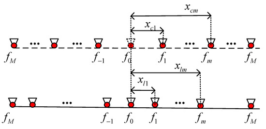 Affected by the structure of FDAA, special frequency offsets are designed according to the position of the virtual array element to obtain a single maximum beampattern with precise focusing. Suppose that the length of a conventional linear FDA is the same as that of the proposed FDAA, and both are symmetrical arrays. The distance between the m-th array element in the linear FDA and the reference array element, , and the distance between the m-th array element and the reference array element on the equiphase surface of the FDAA, , can be respectively expressed as: