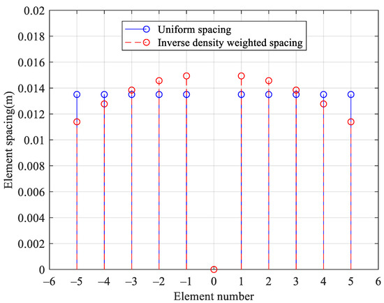 According to the density weighting theory of a phased array antenna, density weighting is the design of antenna array elements with non-equal spacing, which can achieve the sidelobe level reduced by amplitude weighting and simplify the feeder grid design without losing the transmitted power. However, the resolution of FDAA array is affected by the arcuate structure, which forms a fixed non-uniform array of “sparse in the middle and dense on both sides” after the equiphase plane, which is just the opposite of the density-weighted optimization method.