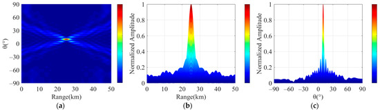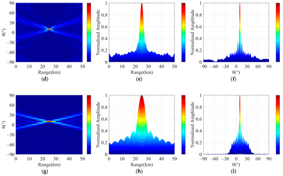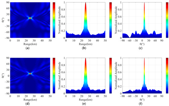 As shown in Figure 12a–c, in the beampattern after Hamming window amplitude weighting in the FDAA, the dot-shaped beam optimization effectiveness is quite noticeable, the first-order sidelobe in the range domain is greatly suppressed, and the sidelobe levels around the main lobe in the range domain are significantly reduced. Compared with the angle domain before optimization, the overall sidelobe level is reduced, and the removal of sharp peaks is noticeable. As shown in Figure 12d–f, the dot-shaped beampattern after the Taylor window amplitude weighting is very similar to that with the Hamming window amplitude weighting. Additionally, the sidelobe level distribution in the range domain is smoother, which is beneficial to the engineering implementation. The main lobe beam is narrower in the angle domain, but the level of the first order sidelobe is slightly higher.