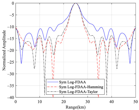 where is a fixed frequency offset, and is a frequency offset based on symmetric logarithm. According to the array structure of the equiphase plane of FDAA, the removal of range-angle coupling can be accomplished by using logarithmic frequency offset distributed symmetrically on both sides. In addition, is a frequency offset based on a cosine window function. Compared with Hamming frequency offset, Hamming frequency offset has better performance in reducing amplitude of the sidelobes. The effectiveness of the two frequency offsets is compared to determine the best frequency offset.