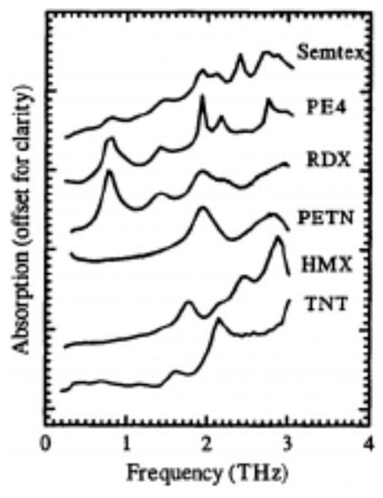 The absorption spectra of some typical explosives are shown in Figure 4. The spectra show features that help to identify the explosives. One must bear in mind that the way that the explosives are prepared and measured can affect their spectrum; nevertheless, some spectral features are robust and do not change despite the preparation method [30]. A comparison of the spectra from different publications [30] shows the similarities and differences of measurements described in different references.