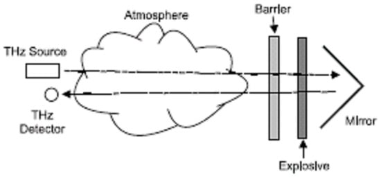 The problem of remote detection is that it requires the generation of THz radiation, its propagation through the atmosphere up to a barrier, the penetration of this barrier and the explosive material, which is hidden behind the barrier, and its reflection from the skin explosive interface back through a detector. Figure 7 shows examples of absorption of various explosive compounds. Most explosive spectral characteristics are robust and are not affected by modification of the explosive material’s preparation method. This indicates that such characteristics are useful for detection schemes. Figure 10 shows the principle of detection of hidden explosives.