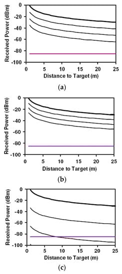 Received power through various clothing items. The blue line designates the receiver noise limit. Minimum detectable power Pmin = 3 · 10−11 W as the receiver noise limit. The example is taken at 0.8 THz frequency within the ~0.8 THz transmission band in the atmosphere, equal to a peak in the RDX THz spectrum (40 dB mm−1 at 0.8 THz). = 1.6 · 10−3 steradians. The RDX thickness is 0.1 mm. P0 = 100 mW, allowing fast image acquisition. (a) Ski jacket—width 0, 3, 6, 9 mm. (b) Corrugated cardboard—width 0, 3, 6, 9 mm. (c) Wool sweater—width 0, 3, 6 mm.