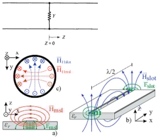A shunt obstacle on a two-wire transmission line. Below we show how the electric and magnetic fields behave at the slot (a) x-z cross section (b) a view of the slot from a side perspective (c) magnetic field lines from above. The figure is taken from [16].