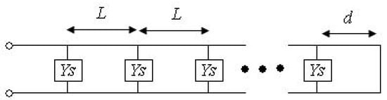 The last slot is a distance from the end (which is shorted-circuited, as seen in Figure 17), and the slot elements are spaced a distance from each other. The distance between the last slot and the end, , is chosen to be a quarter-wavelength. Transmission line theory [1] states that impedance of a short circuit a quarter-wavelength down a transmission line is an open circuit, hence, Figure 17 then reduces to Figure 18.