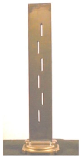 A picture of a complete waveguide slot antenna is shown in Figure 19 This example has six slots on each side for a total of twelve slots. The slots have identical length and spacing along the waveguide. Note how the slot position alternates about the centerline of the guide. The far wall of the waveguide has an identical slot pattern, so you can see through the slots.